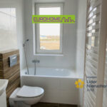 - Łazienki gotowe: wyłożone płytkami, zamontowane wanny, umywalki oraz toalety.